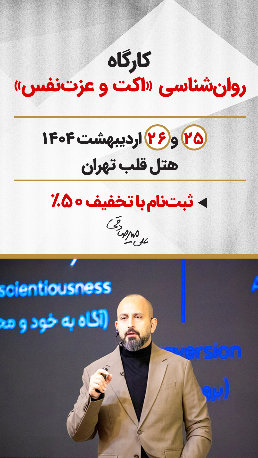 دومین کارگاه روانشناسی اکت و تنظیم هیجانات با تدریس دکتر علی میرصادقی، نویسنده، EFT درمانگر و ACT تراپیست، روزهای ۱۶ و ۱۷ مرداد ۱۴۰۴ در مرکز همایشهای بینالمللی هتل قلب…