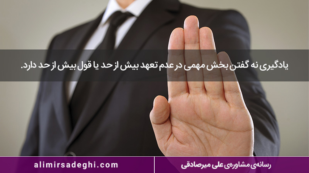 اغلب اوقات رهبر قابل اعتماد اولین کسی است که از او می خواهند مسئولیت بیشتری را بپذیرد. یادگیری نه گفتن بخش مهمی در عدم تعهد بیش از حد یا قول بیش از حد دارد.