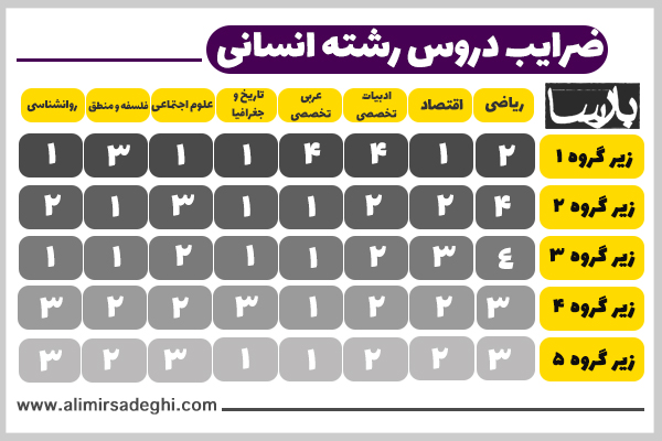 ضرایب دروس اختصاصی زیرگروه پنج رشته انسانی
