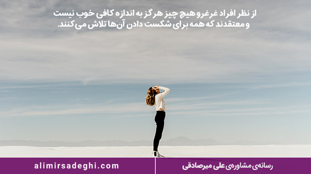 یکی از مهمترین ویژگیهای افراد غرغرو بدبینی است. آنها همیشه نیمه خالی لیوان را به جای نیمه پر میبینند. بر اساس سناریوها و تجربیات قبلی که با آنها روبرو شدهاند همه چیز را قضاوت میکنند، آنها انتظار دارند همه چیز شکست بخورد.